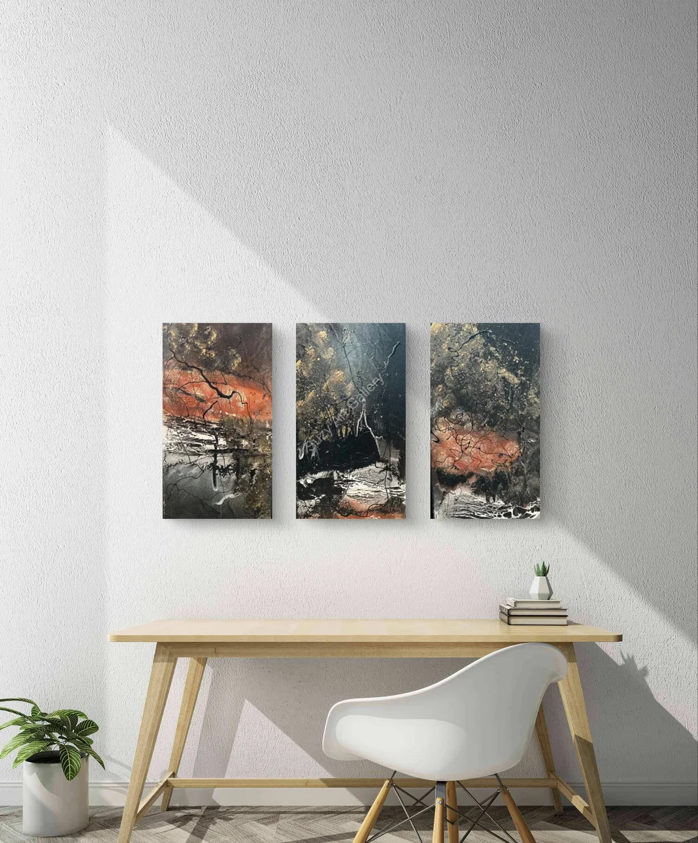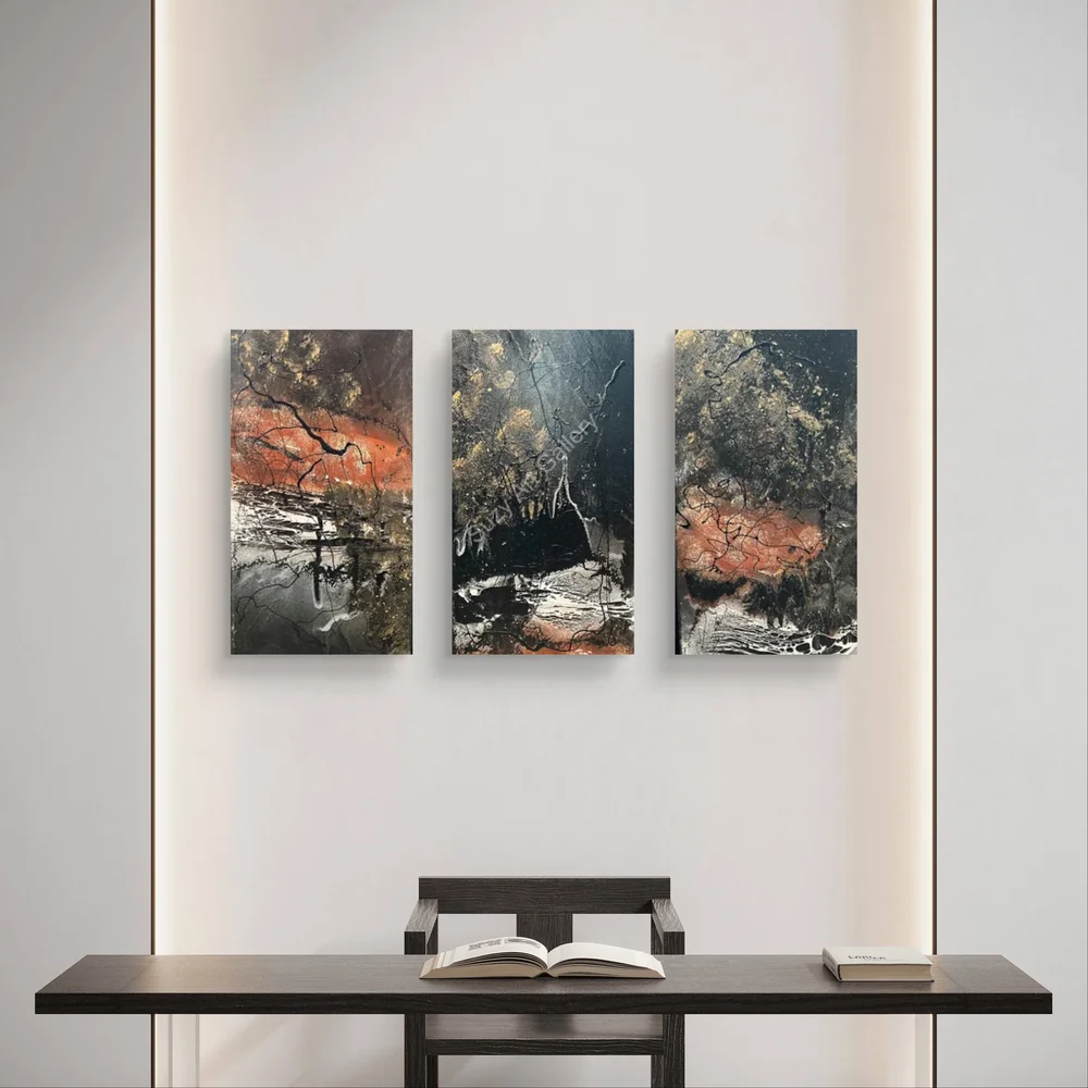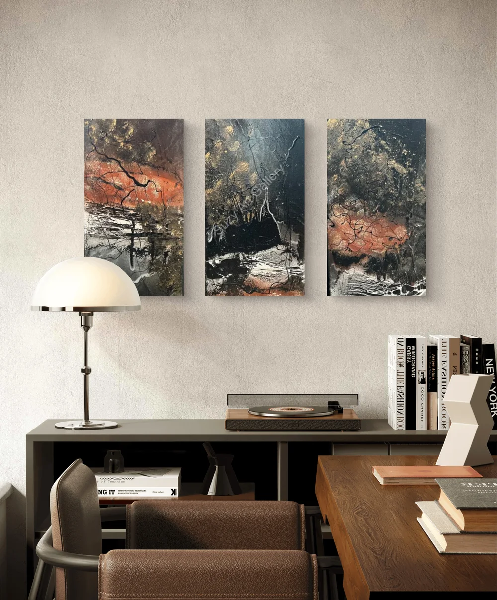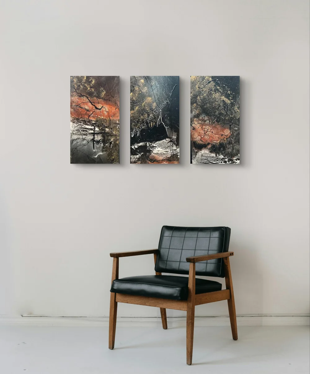 The series of paintings entitled "Nature" evokes a mystical and magical atmosphere in three different parts. The interplay of black, red, gold and white colours suggests a darkness and mystery at night, as if immersed in an invisible mirror of water. This artwork does not depict a specific element of nature, but rather offers a series of elegant compositions expressing abstract and magical nature. The title suggests quirkiness and mystery, appealing to those looking for a deeper and thought-provoking artistic experience to decorate their home or office.