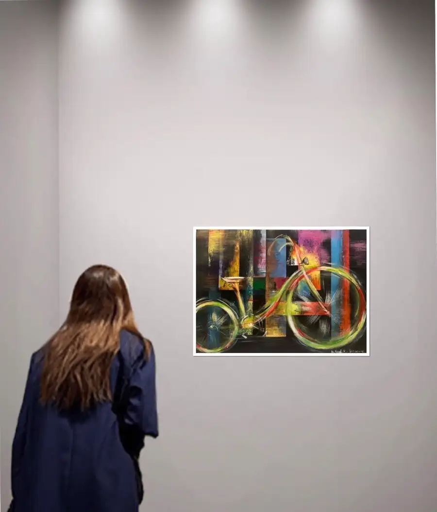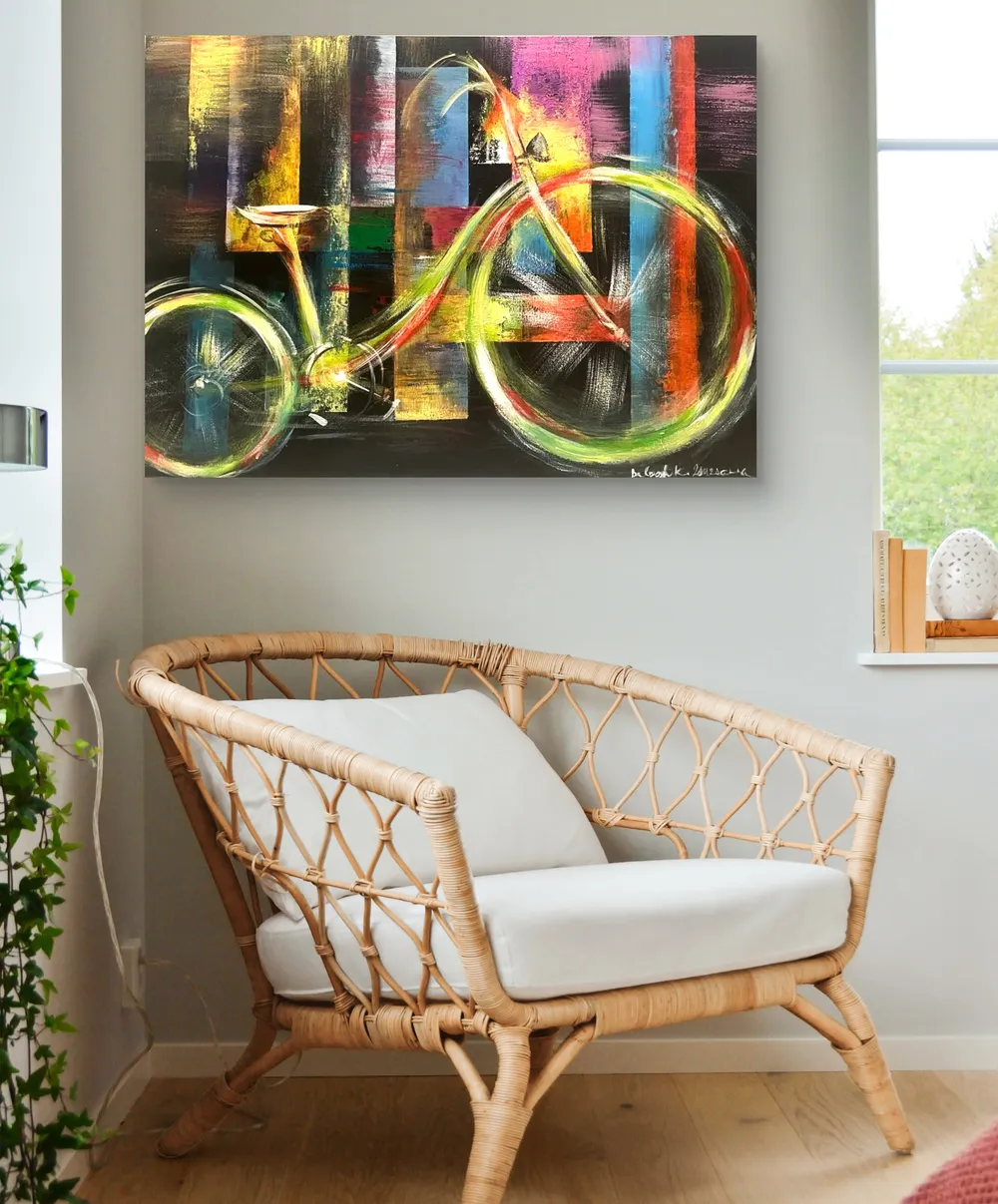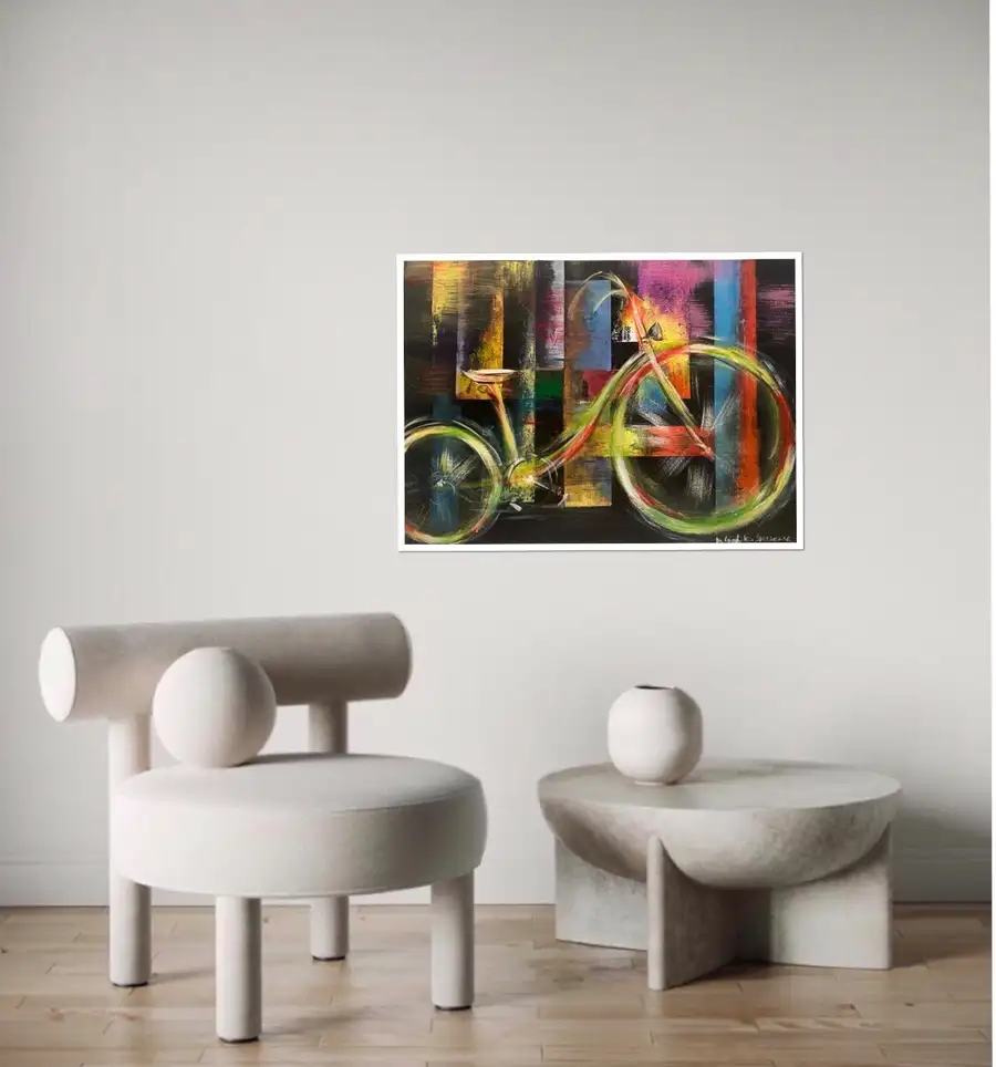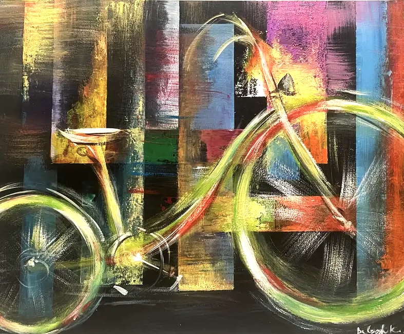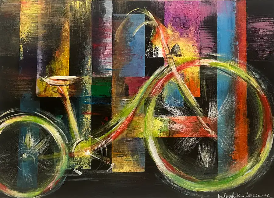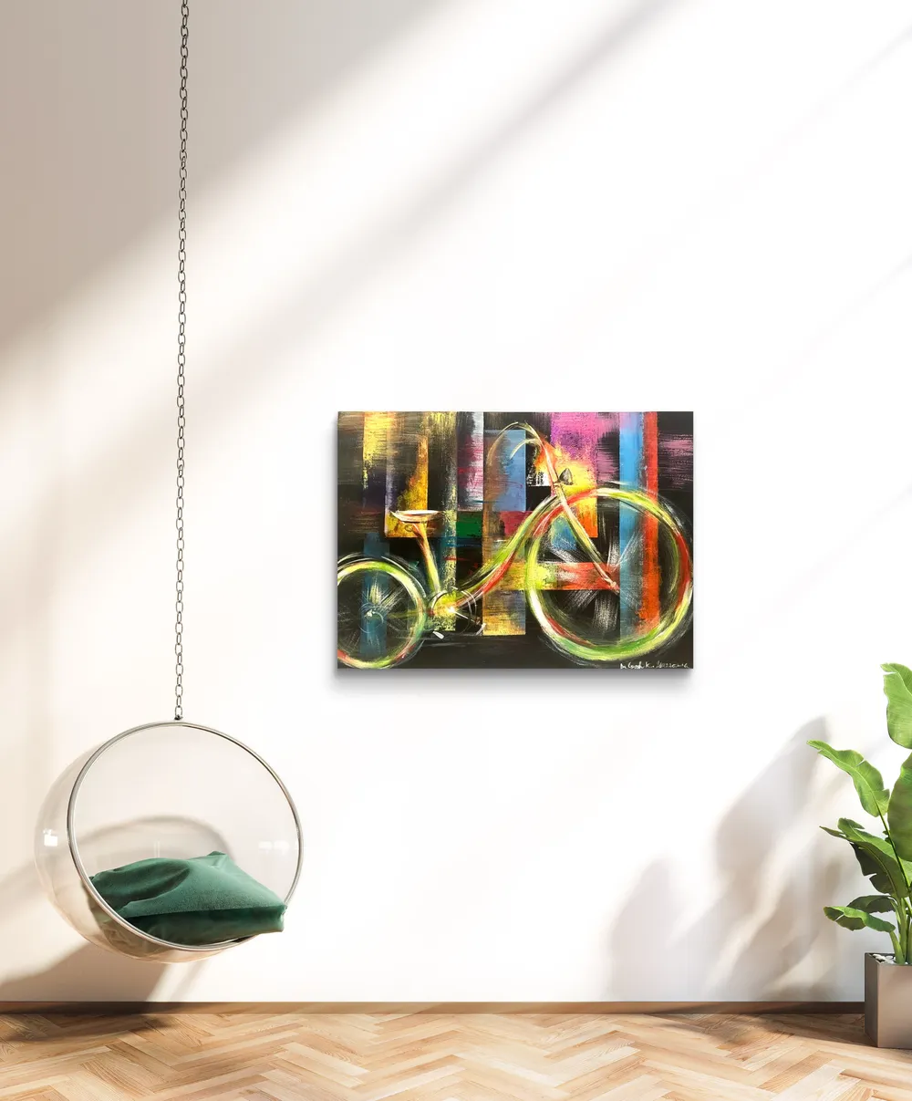 This dynamic abstract painting exudes a vibrant energy, where the harmony of geometric shapes and bright colours creates a sense of movement and freedom. The black depth of the background contrasts with the bright yellow, green, blue and orange lines that evoke the shape of a bicycle. The artwork seems to reflect an urban landscape or the rhythm of modern life, where momentum and balance are both present. This painting is a symbolic embodiment of freedom and the flow of life.