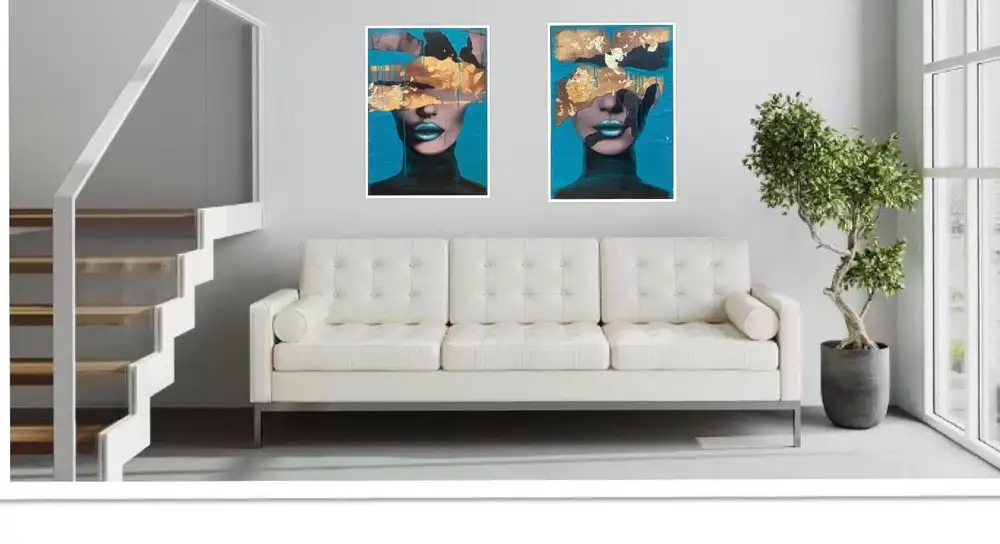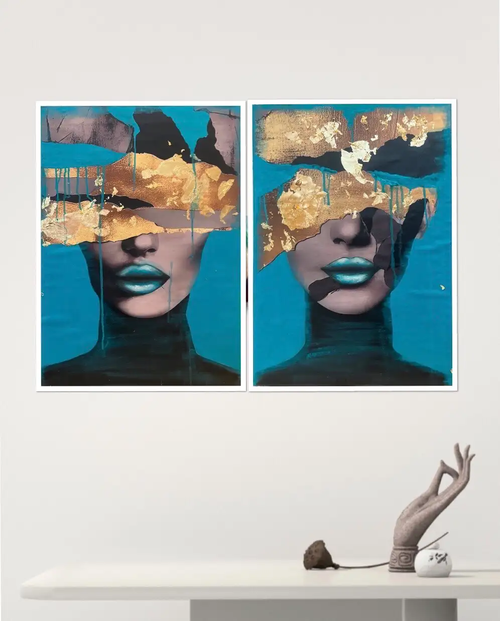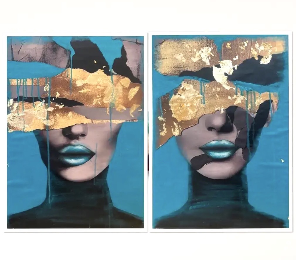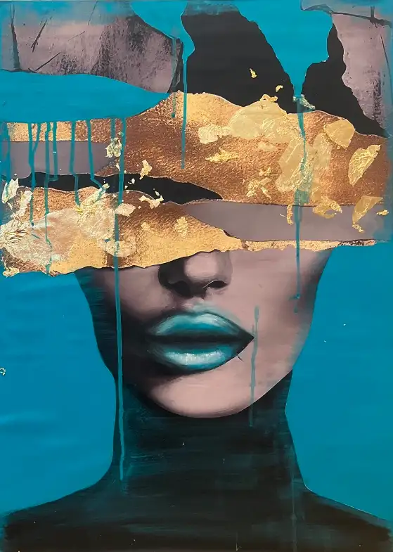 This two-part painting has a deep, emotional concept. The composition depicts a face, with gilded textures and seemingly random, dynamic paint drips covering the eyes and part of the forehead. The gold and vivid turquoise background create a harmonious contrast, while the dark tones add drama and mystery. The lips are exceptionally detailed, their luminous effect giving a futuristic and sculptural look.