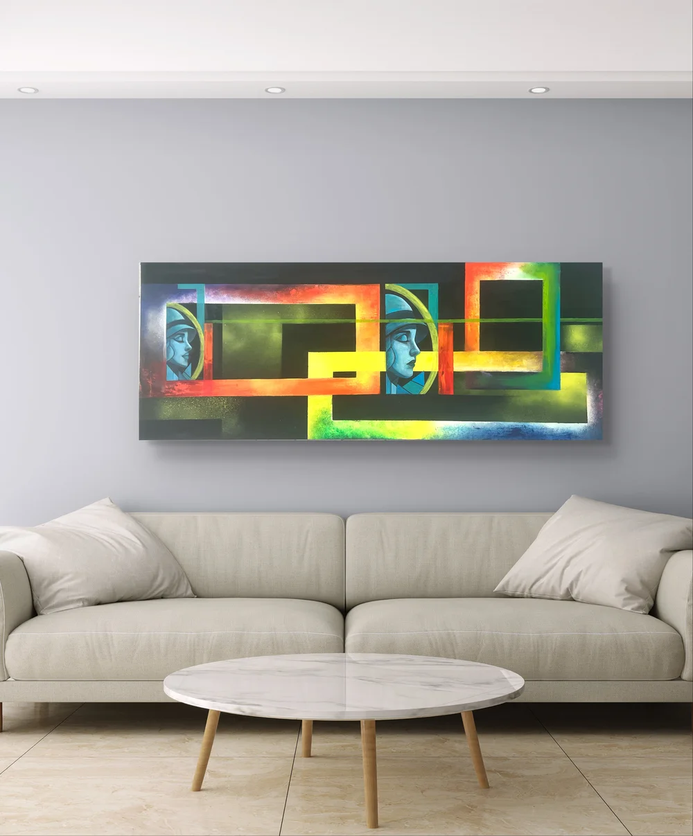 Art Deco and contemporary geometric abstraction characterizes this painting, which is a combination of It is called Parallel Realities.