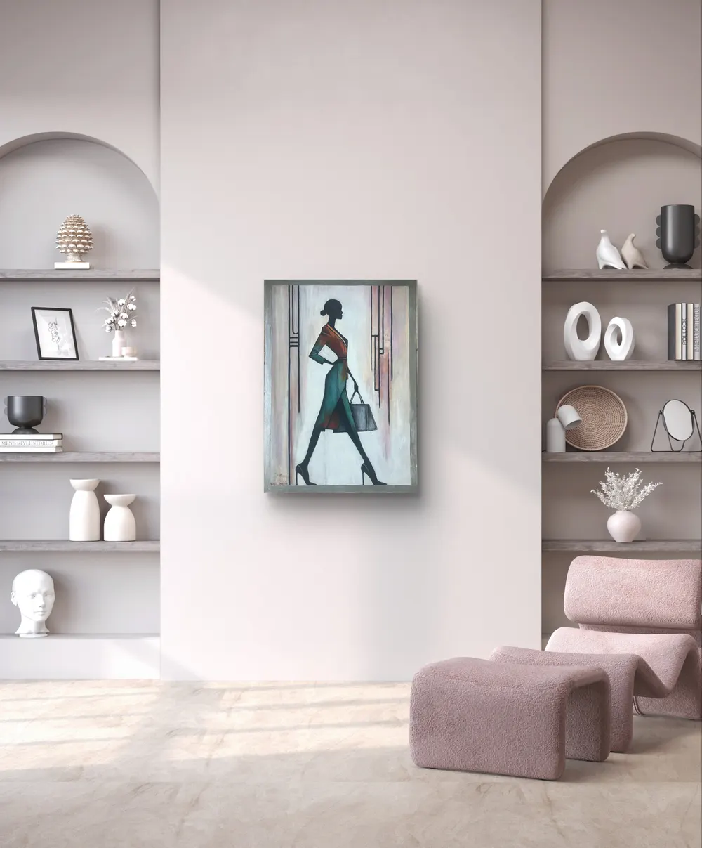 This modern painting with geometric elements is a symbol of feminine strength, elegance and independence. The contrast between the clean background and the strong silhouette creates a unique balance of dynamism and sophistication. High heels, a stylish dress and a handbag are not just fashion accessories, they are symbols of self-identity and determination.