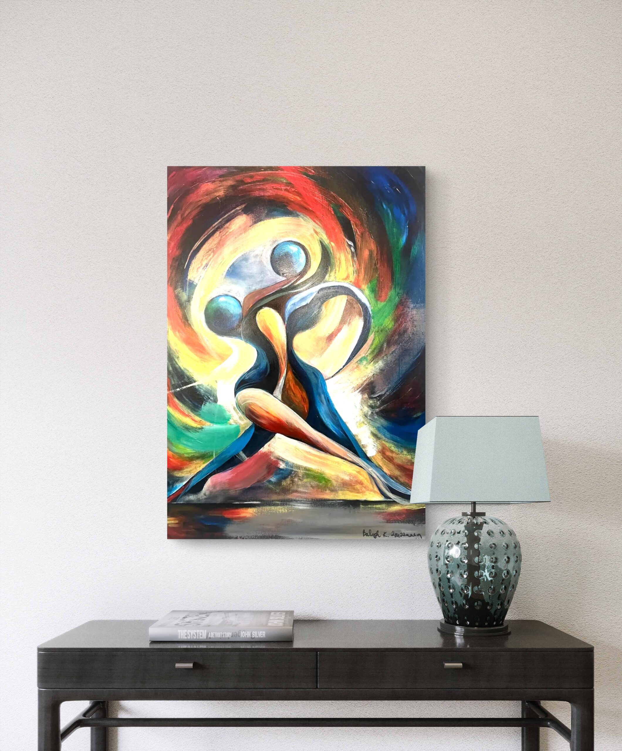 A dynamic, emotive painting that evokes passion and the momentum of movement. The vibrant colours - red, yellow, blue and green - swirling around the abstract figures of the two dancers reflect the fervour and energy of the dance. The composition exudes harmony and intensity, while the dynamic motifs of the background further enhance the power of the movement, bringing passion to life in an immersive way.