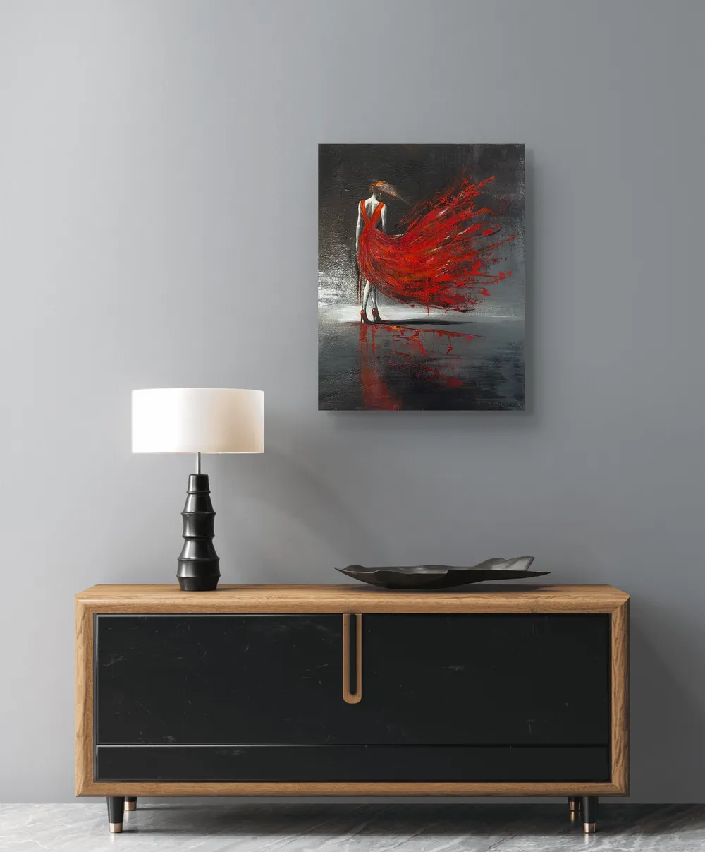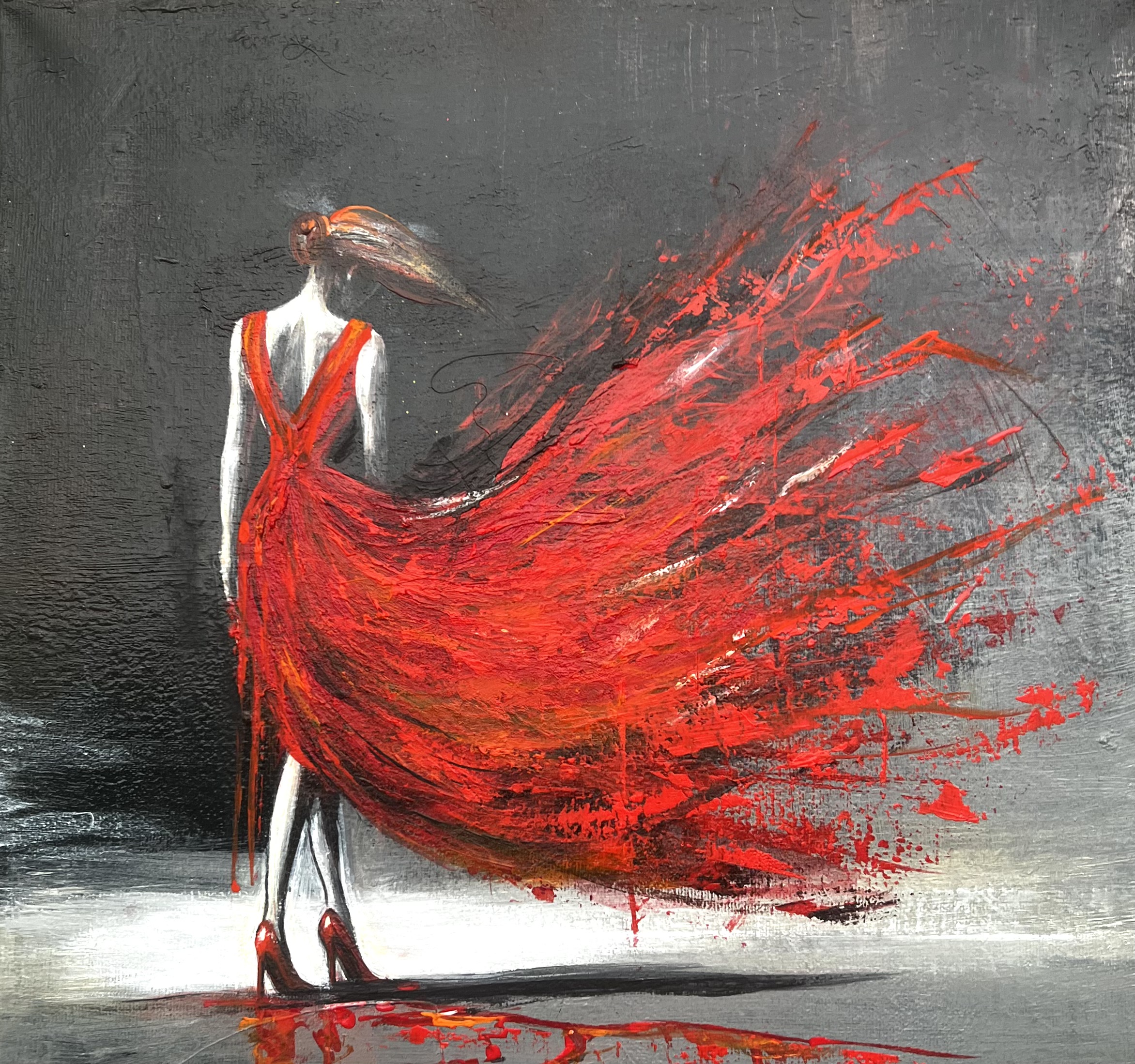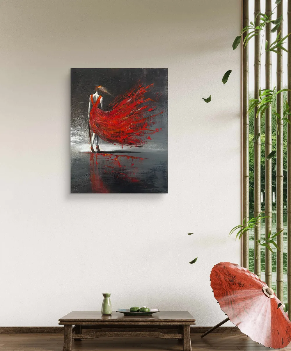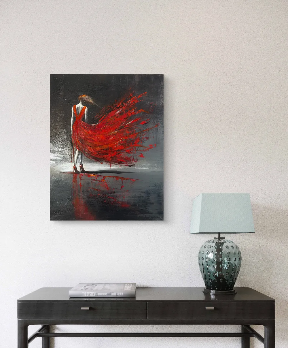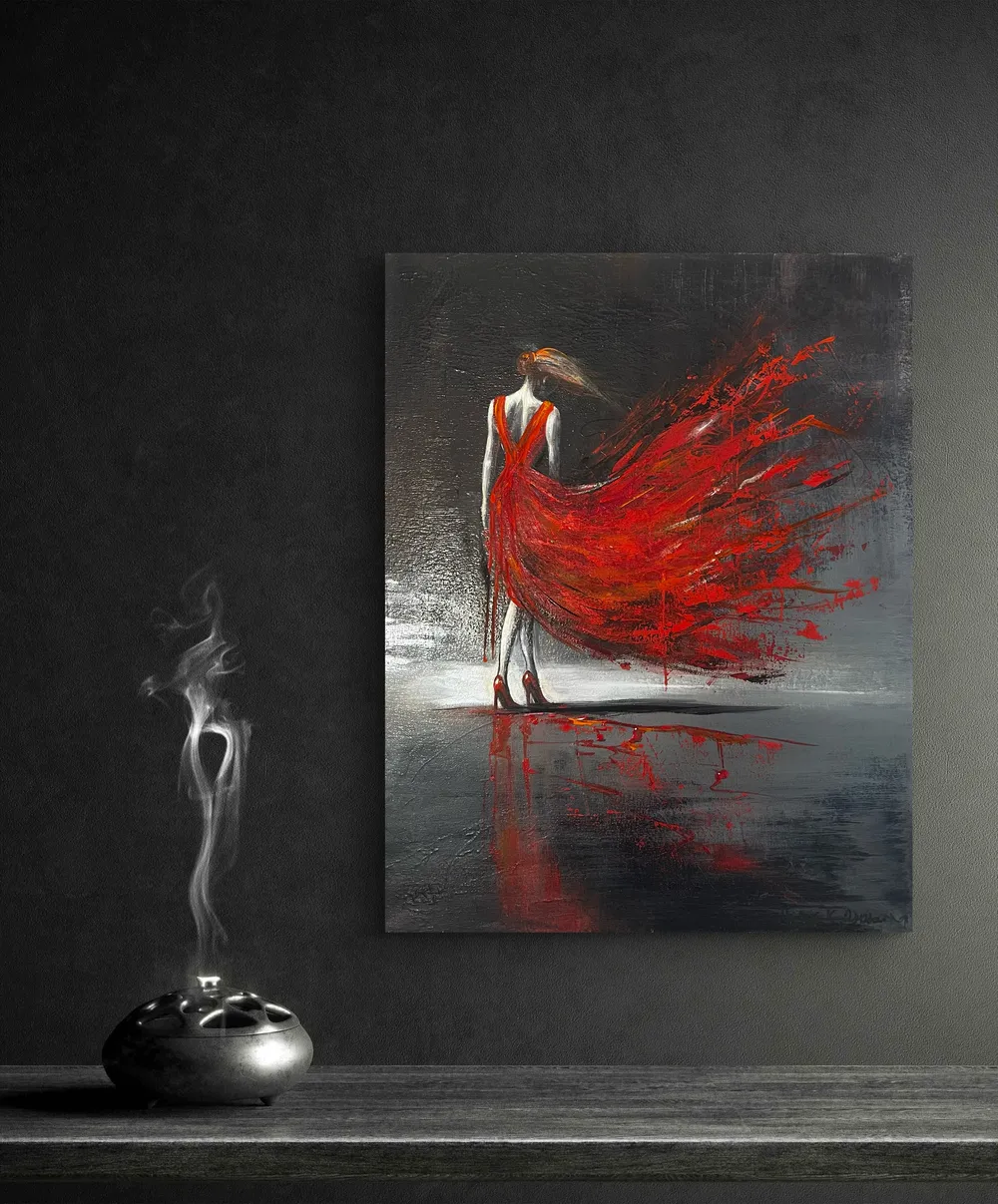 The Storm is a powerful, dynamic painting that depicts inner strength and perseverance through the figure of a woman. The fiery red dress symbolises struggle, passion and the will to survive, while the dark tones of the background intensify the drama of the scene.