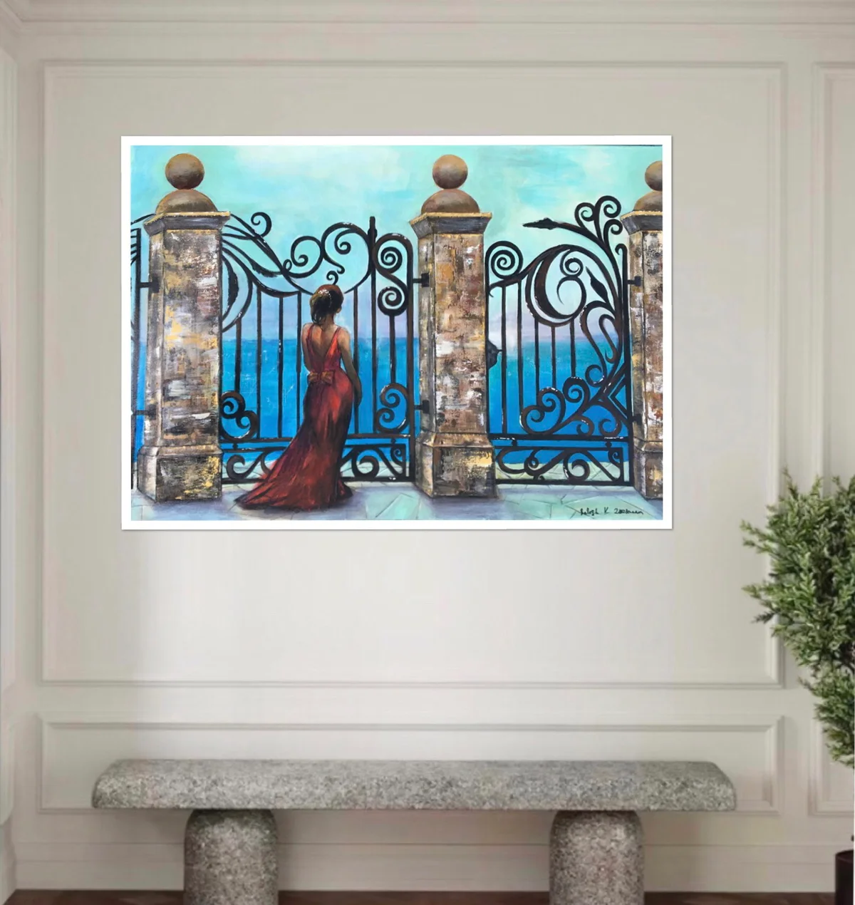 A ” Merengés a tengerre ” című festmény Los Gigantes varázslatos tengerpartjának lenyűgöző panorámáját örökíti meg, ahol a tenger és a kovácsoltvas kerítés találkozik. Egy meghitt pillanatot örökít meg, ahol egy piros ruhás nő elidőzik a kerítés előtt, szemeit a végtelen kék óceánra szegezve. A festmény nem csupán egy tájképet fest, hanem egy érzelmekkel telített pillanatot közvetít, amely elvarázsolja és elgondolkodtatja a nézőt. Mintha ott lenne a tengerparton, ahol a szél simogatja az arcát és a só illata érződik a levegőben. A festmény tulajdonosának ez az alkotás lehetőséget ad arra, hogy egy kis darabot vigyen magával ebből az idillikus helyről, és mindennap elvarázsolja ez a különleges élmény.