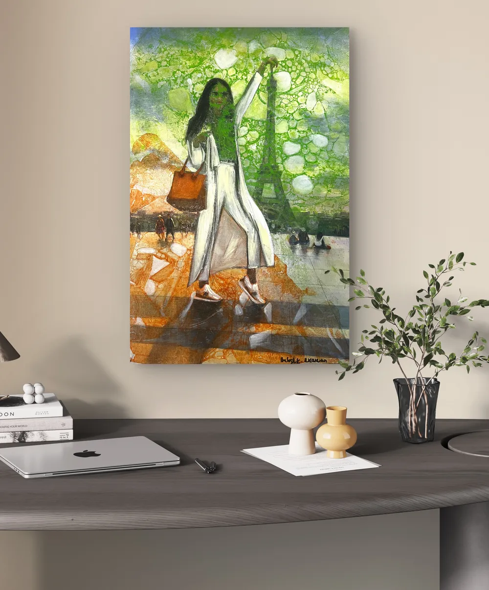 A nő fehér ruhája és lendületes lépése a szabadságot, az előrehaladást és az önazonosságot jelképezi. A barna táska és a környező figurák finoman földelik a jelenetet, miközben az Eiffel-torony ikonikus formája a festményben szinte belesimul az álomszerű háttérbe.