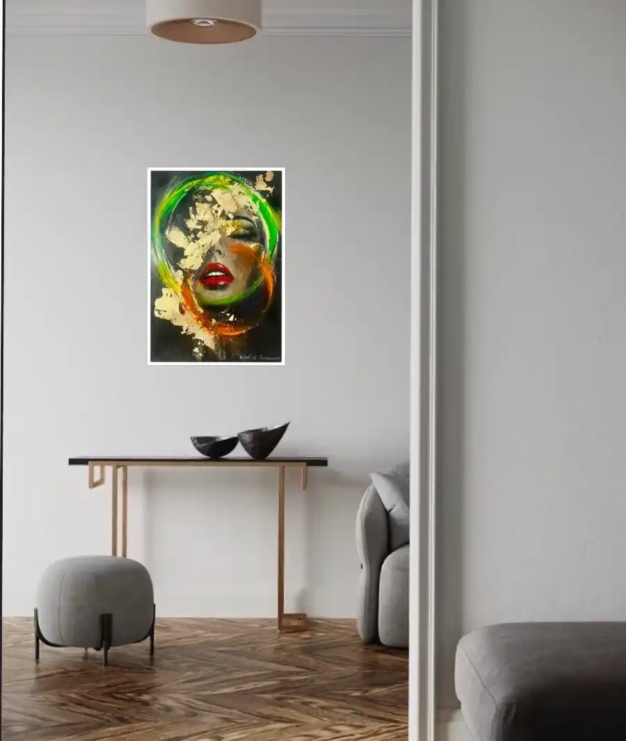 Ez a festmény magával ragadóan ötvözi a modern absztrakciót és a klasszikus portréművészetet. A fekete háttérből egy női arc bontakozik ki, amelynek telt, vörös ajkai és finom részletei erős érzelmi kifejezést sugároznak. Az arcon körbefutó zöld és narancssárga színű ecsetvonások dinamizmust és energiát hoznak a kompozícióba, mintha az érzelmek körkörösen áradnának. A mű aranyfólia-darabokkal díszített, amelyek fényűző, drámai hatást keltenek, mintha a portré valósága szétrobbanna és újra összeállna. Az egész alkotás egyszerre sugall törékenységet és erőt, miközben az absztrakt elemek és a realizmus közötti határvonalon egyensúlyoz.